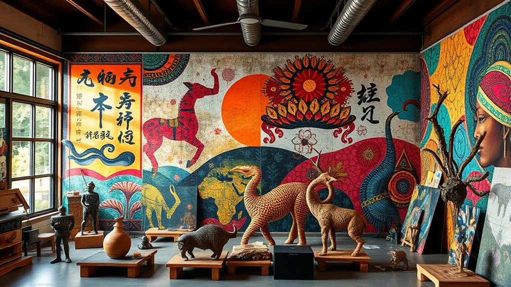 Have you ever noticed how different cultural elements blend seamlessly in some artworks? That’s the essence of cultural fusion in art. It’s about embracing cultural diversity and weaving it into creative expression, resulting in innovative pieces that transcend borders. Artistic innovation thrives when artists draw inspiration from various traditions, symbols, and techniques, creating something unique and original. This blending isn’t just about combining styles; it’s about celebrating differences and finding common ground. By understanding cultural fusion, you recognize how artists challenge norms and push boundaries, fostering a richer, more dynamic art scene. It’s this interplay of diverse influences that sparks fresh ideas and fuels growth in the creative world, making each piece a testament to the power of cultural exchange. Recognizing cultural diversity in art can also inspire new avenues for creative expression and collaboration. Moreover, appreciating the intercultural dialogue behind artworks can deepen your understanding of their significance and impact. Engaging with regional influences can further enrich your appreciation for the diverse sources shaping artistic fusion. Additionally, an awareness of cultural intelligence can help artists and audiences navigate and value the complexities of intercultural interactions within art. Recognizing how artistic styles merge across cultures can further illuminate the dynamic nature of this fusion.
