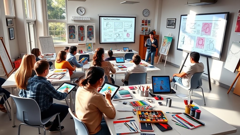 Building on the digital tools that support flipped art instruction, engaging students actively is key to fostering their creativity and motivation. You can promote peer collaboration by designing activities that require students to work together on projects or critique sessions. This not only encourages shared ideas but also builds a supportive learning community. Giving students creative autonomy allows them to choose topics, mediums, or techniques, making their work more meaningful and personally invested. To boost participation, set up interactive discussions or reflection prompts that invite students to share their insights and processes. When students feel empowered to take ownership of their learning, they become more enthusiastic and eager to contribute. Incorporating student feedback through surveys or discussions can further enhance engagement and tailor instruction to their needs. Additionally, understanding the emotional support needs of students can help create a more inclusive environment where all students feel valued and motivated. As technology advances, integrating artificial intelligence tools can provide personalized guidance to students, further enriching their learning experience. Incorporating tools that facilitate interactive feedback can also help students refine their skills in real-time. Leveraging educational technology can foster a more interactive and engaging art classroom environment where active participation and collaboration thrive.