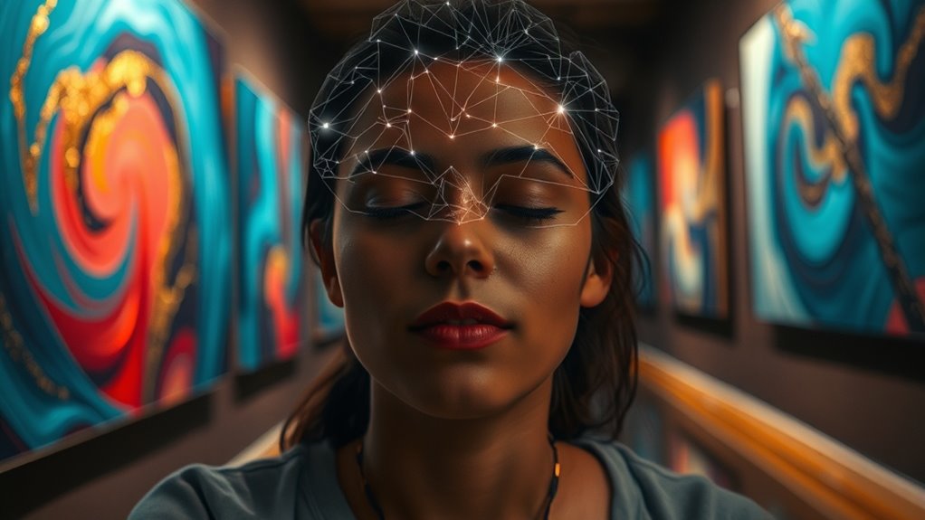 When you view art, your brain activates intricate neural pathways that link sensory areas like the visual and auditory cortex with emotional and memory centers. This process stimulates the release of neurochemicals such as dopamine and endorphins, which boost your mood and create feelings of pleasure, awe, or reflection. The way your brain responds depends on your personal experiences and cultural background, shaping your emotional journey. Keep exploring to discover how these neural connections influence your everyday mood and perception.
