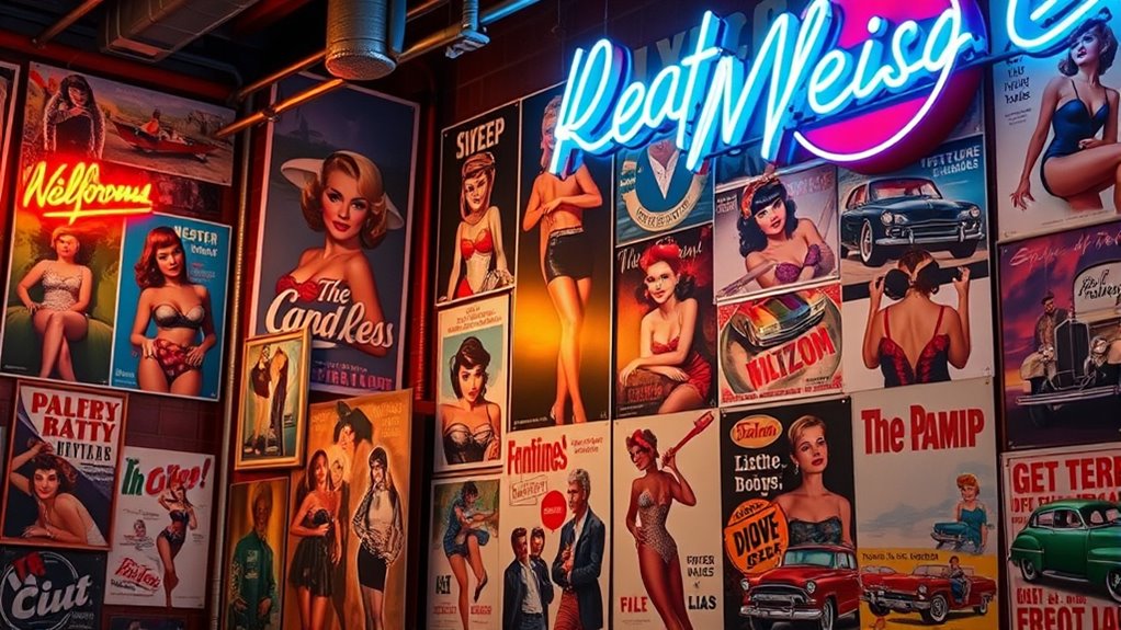 You notice how iconic retro imagery, like bold patterns and vintage symbols, instantly evokes a sense of nostalgia. In art, certain motifs carry deep meaning, connecting past themes with contemporary interpretations. Pay attention to color palette choices, as they often reflect the era’s mood and help reinforce the vintage vibe. Incorporating wall decor ideas can further enhance the nostalgic atmosphere in your space. Recognizing the significance of visual motifs and symbolism from the past can deepen your appreciation for how these elements influence modern design and art.