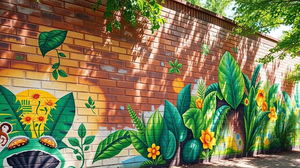 Eco-friendly street art involves using non-toxic, biodegradable materials that protect the environment while making vibrant, durable murals. These eco-conscious paints and sprays reduce pollution, avoid harmful chemicals, and support sustainability. They also help you create colorful, long-lasting artwork without damaging ecosystems or generating hazardous waste. By choosing these sustainable options, you set a positive example and turn your murals into powerful acts of environmental advocacy. If you keep exploring, you’ll discover even more ways to make a positive impact.