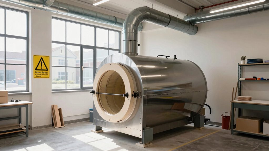 You can’t afford to take chances when operating a kiln. Always wear personal protective equipment like heat-resistant gloves, safety glasses, and a respirator if needed. Keep a fire extinguisher nearby and know your emergency response plan. These precautions help prevent accidents and injuries, ensuring you’re prepared for any mishaps. Remember, safety gear isn’t just a suggestion—it’s your best defense in the heat of the moment.