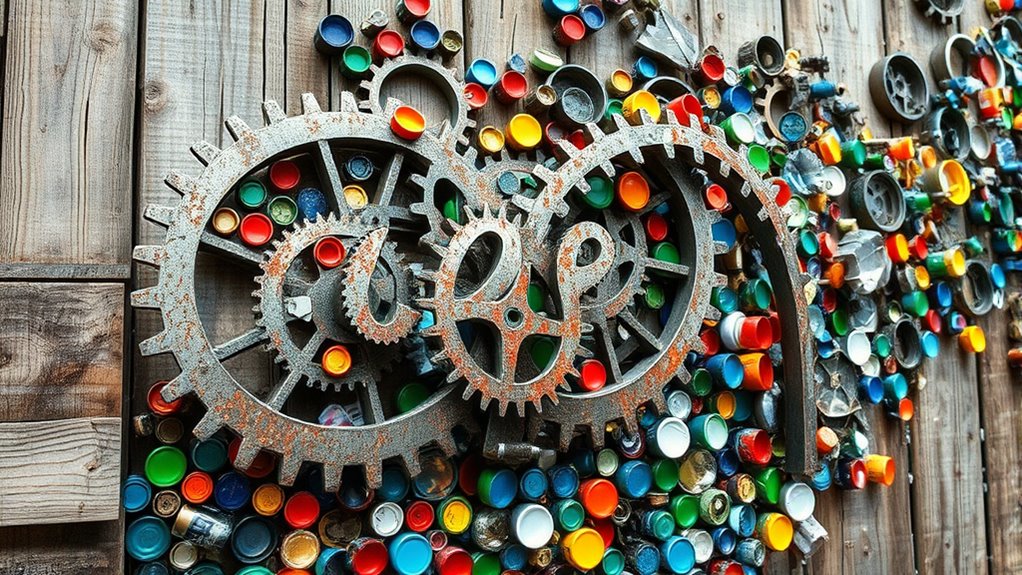 You’ll find that common waste used in upcycled art includes plastics, glass bottles, cardboard, metal scraps, and fabric remnants. To effectively incorporate these materials, understanding recycling techniques and waste categorization helps you select suitable items. By sorting waste properly, you can transform discarded objects into stunning art pieces, giving new life to materials that might otherwise be thrown away. This approach makes your upcycling projects more sustainable and creative.