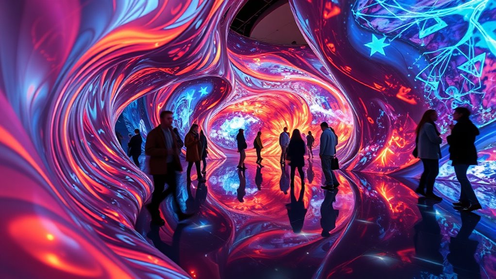 Building on the integration of digital and physical environments, sensory immersive experiences heighten engagement by appealing directly to your senses. These installations surround you with sights, sounds, textures, and even smells that deepen your connection to the art. You might walk through a room where projections change with your movements or touch surfaces that react with light and sound. These environments create a sense of presence, making you feel part of the artwork itself. To capture your attention, creators often incorporate: