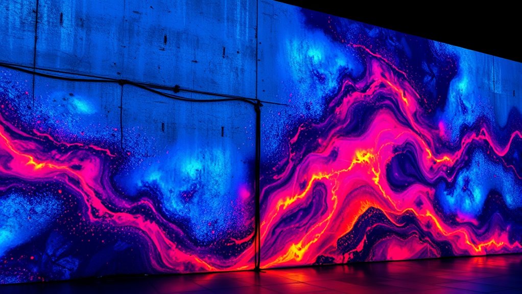 You’ll find that digital projection technologies are at the core of creating immersive VFX experiences, allowing artists to transform surfaces into dynamic displays. Mixed media materials, like LED screens, holograms, and reflective surfaces, expand the possibilities for integrating visuals into physical spaces. Understanding these techniques and materials helps you appreciate how contemporary VFX art pushes creative boundaries. Additionally, the use of interactive projection mapping enables real-time audience engagement and further enhances the immersive experience.