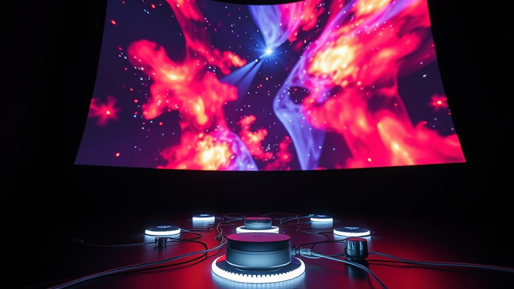 Immersive installations use a combination of advanced technologies like high-resolution projectors, sensors, and specialized hardware to create engaging environments. Motion detectors, depth cameras, and infrared sensors track your movements and responses in real time, allowing visuals, sound, and tactile effects to adapt seamlessly. Sophisticated software and AI coordinate these components, crafting dynamic experiences that respond to your presence and actions. If you continue exploring, you’ll discover how these technologies work together to produce stunning immersive worlds.