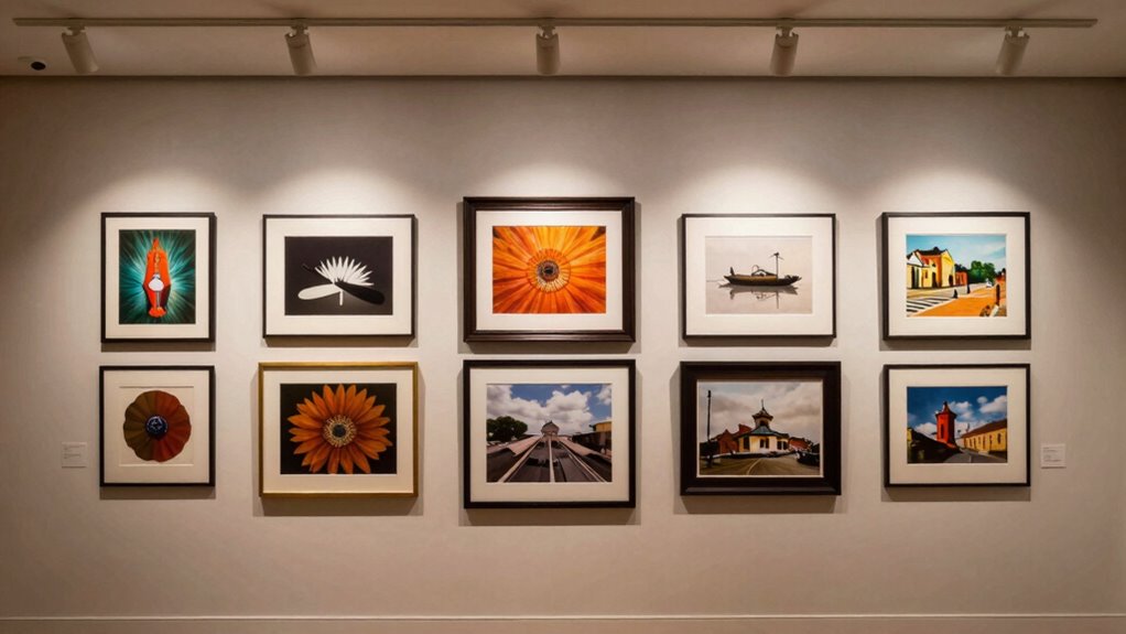 Spotlight placement is equally vital. Instead of relying solely on ambient lighting, strategically position small, adjustable spotlights to cast focused beams on individual pieces. Aim the lights directly at each artwork, ensuring the illumination is even and free of glare. You might mount these spotlights on the ceiling or wall, angling them to highlight specific areas. Using adjustable fixtures allows you to change the focus as your collection evolves or as you rearrange your gallery wall. When positioning spotlights, consider the height and angle to prevent harsh shadows or reflections, especially on glass or glossy surfaces. Proper placement creates depth and dimension, making each piece stand out.