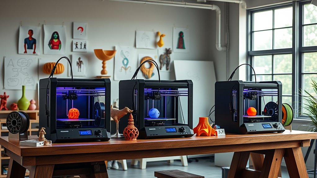 Choosing the right 3D printer for art studios means paying close attention to print resolution quality, as it directly affects the level of detail and surface smoothness in your creations. Higher resolutions, like 4800 DPI or 7K, produce sharp, intricate details essential for fine art and complex designs. Resin printers with high-resolution capabilities typically offer smoother surfaces and finer detail compared to filament-based models. The layer height and pixel resolution determine how smooth or detailed your finished piece will be, with consistent high resolution reducing the need for extensive post-processing. Additionally, selecting a printer with adjustable resolution settings lets you balance detail and speed depending on your project’s needs. Ultimately, ideal resolution enhances your artwork’s quality and saves time in your workflow.