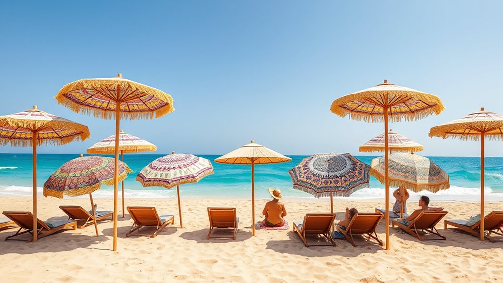 Boho beach umbrellas withstand strong coastal winds thanks to sturdy materials and smart design features. I always look for umbrellas with reinforced ribs and wind-resistant fabrics, which help them stay grounded. Securely anchoring the umbrella with stakes or weights is vital too. I also prefer models with vented canopies that allow wind to pass through, preventing toppling. These tips keep my umbrella stable and stylish, even during gusty seaside days.