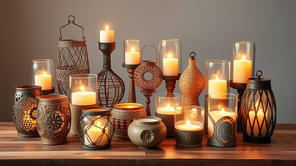 If you’re into minimalist decor, I recommend sleek, simple candle holder styles like clear glass cylinders or matte black metal designs. These options add just the right touch of elegance without overwhelming your space. I love how minimalist holders emphasize clean lines and subtle textures, creating a calm, uncluttered vibe. They’re versatile too—perfect for pairing with modern, Scandinavian, or even boho spaces if you want a touch of contrast.