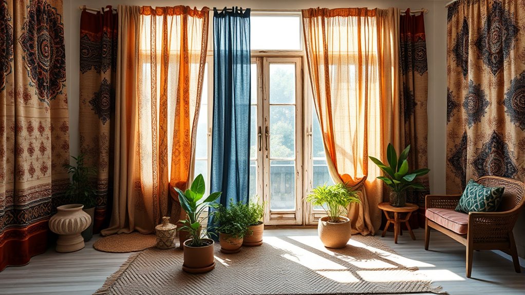Think of your room as a garden—curtains are the gentle breeze that shapes its vibe. Choosing the right boho panels is like selecting flowers that bloom with personality and charm. When you pick the perfect drapes, you’re not just filtering light; you’re cultivating a space that feels alive and inviting. So, let your decor blossom with the curtains that speak to your soul and turn your home into a bohemian oasis.