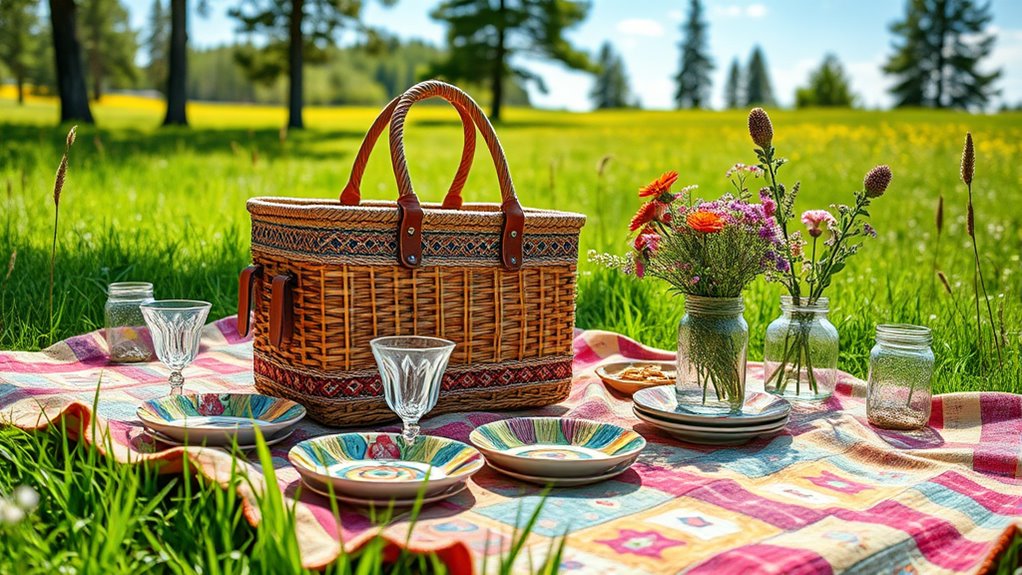 If you’re looking for the best boho picnic baskets that blend style and practicality, I’ve got you covered. From handcrafted wicker designs with removable liners to versatile sets with cooler compartments and foldable tables, there are options for every outdoor occasion. These baskets offer rustic charm, durability, and handy features like reinforced handles and accessories. Keep exploring to discover the perfect mix of vintage appeal and useful details to elevate your next outdoor outing.