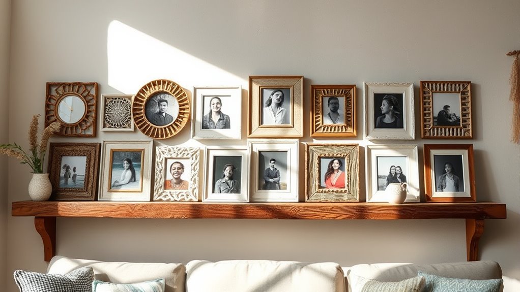 Think of durable materials as the sturdy branches of a resilient tree, supporting your cherished memories. I find that hardwoods like mango and teak are fantastic because they’re tough yet beautifully natural. Metal frames, especially those made from brass or aluminum, also stand strong against time. These choices guarantee your boho frames not only look charming but also last, giving your décor a lasting touch of earthy elegance.