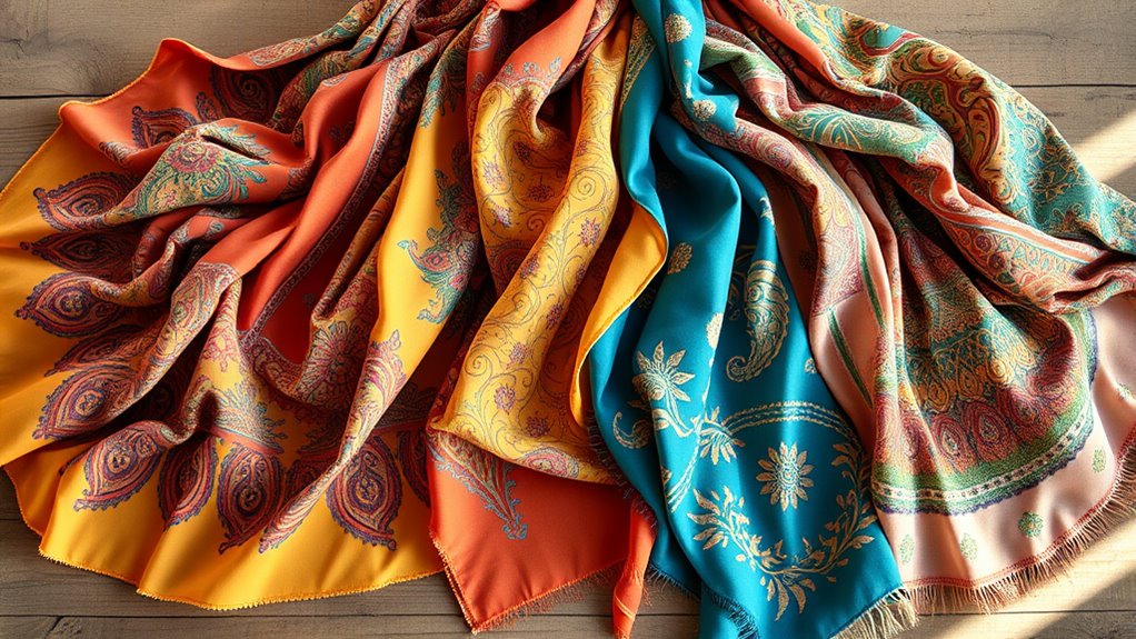 Seasonal trends deeply influence boho scarf designs, shaping colors, patterns, and fabrics I choose. In spring, I opt for light, floral prints, while fall calls for richer hues and cozy textures. I love staying updated on fashion shifts because they help me select scarves that feel fresh and relevant. Embracing these trends allows me to express my personal style confidently, adapting to the seasons effortlessly.