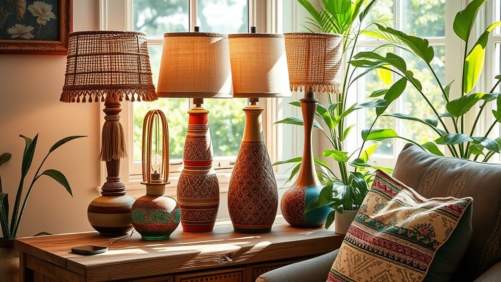 If you’re looking to add charm and style to your home, I recommend exploring the top 13 boho table lamps. These designs feature natural materials like rattan, wicker, and fabric shades that create cozy, rustic vibes. Many options include dimmable controls, USB charging ports, and rechargeable batteries, making them both beautiful and functional. Keep in mind your space and style needs—if you continue, you’ll discover tips to choose the perfect one for your home.