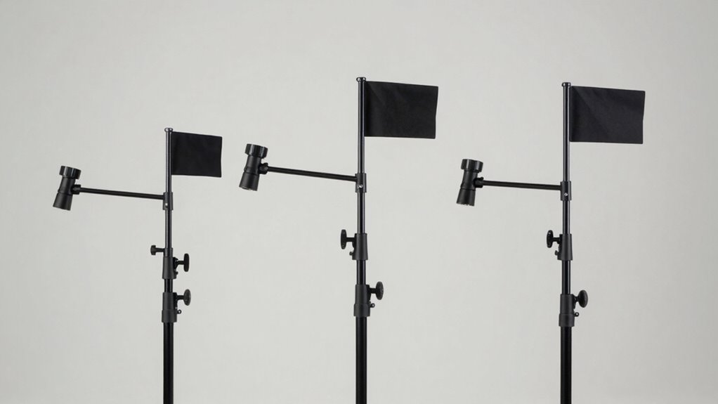 A wide adjustable height range is indispensable for a versatile C-stand kit, as it lets you adapt to different lighting setups quickly. I look for stands that can go from about 5 to over 10 feet, giving me flexibility for various scenes. Precise height adjustments are critical for placing lights, reflectors, and modifiers at the right level. Telescoping sections with reliable locking mechanisms ensure stability when fully extended, which is crucial for safety. Higher maximum heights are especially useful in large spaces or when working with tall ceilings. Additionally, adjustable crossbars and boom arms provide extra flexibility for positioning lighting equipment at different heights and angles. Overall, a broad height range and fine-tuning options make a C-stand kit more adaptable and efficient on set.