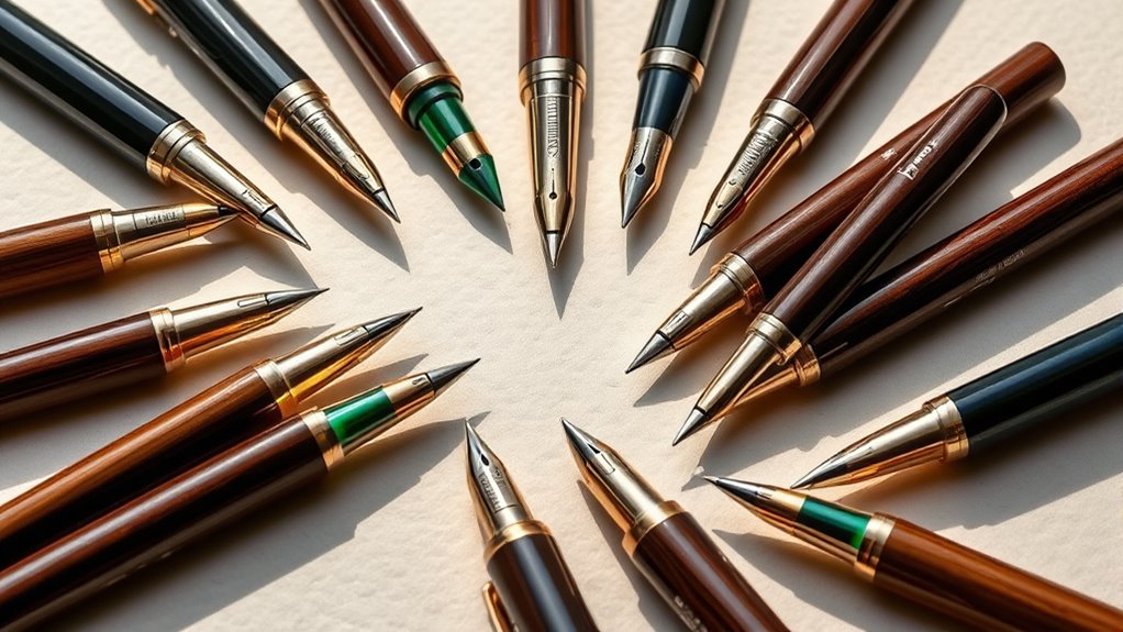 Choosing the right nib types and sizes is essential because they directly influence the style and precision of your calligraphy. Different nibs, like flat, pointed, or brush, create unique strokes and line qualities, shaping your technique. Nib sizes range from very fine (around 0.3mm) for detailed work to broad (over 3mm) for bold lettering, giving you versatility for various projects. Interchangeable nib sets are a great option, allowing quick swaps between styles and line weights without hassle. The material of the nib, usually steel or gold-plated, affects durability, ink flow, and flexibility, impacting your overall writing experience. Selecting nibs suited to your skill level and style can help you gain better control and produce higher-quality work with less frustration.