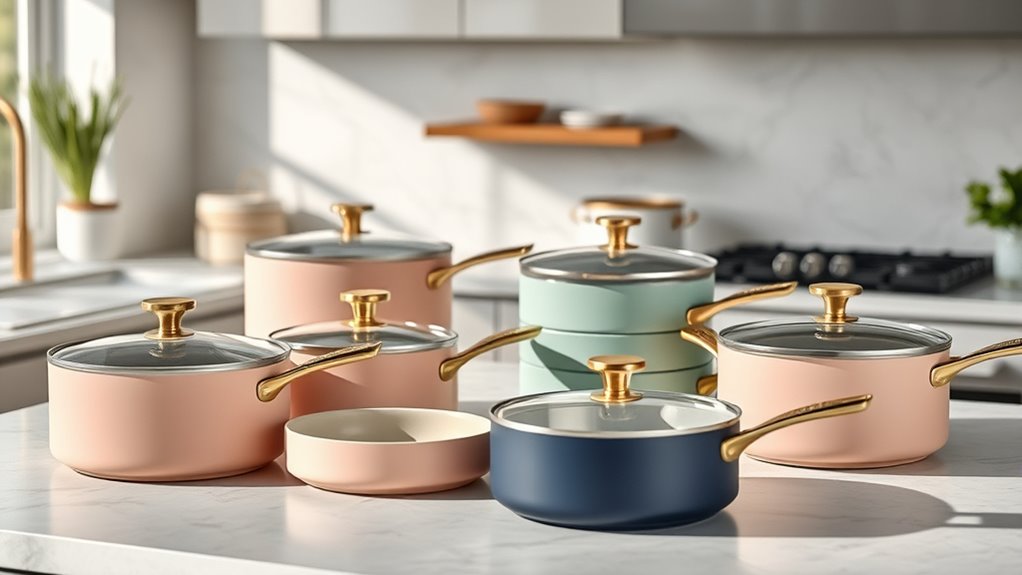 If you’re looking to elevate your kitchen in 2025, I recommend checking out the top Caraway cookware sets. Their options range from 12-piece starter sets to extensive 31-piece collections, all featuring stylish designs, non-toxic ceramic coatings, and compatibility with all stovetops. These sets are durable, easy to clean, and perfect for versatile cooking. Keep exploring to discover which set best suits your needs and how Caraway can transform your culinary space.