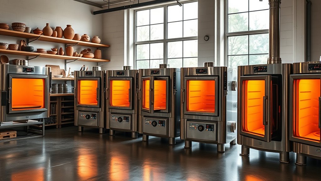Top kiln models usually come with essential safety features like automatic shut-off, temperature controls, and overheat protection to keep me safe during firing. I also appreciate built-in door interlocks and alarms that alert me if something’s wrong. These features give me peace of mind, ensuring I can focus on my artistry without worrying about accidents or equipment failure. Safety always comes first in my studio.