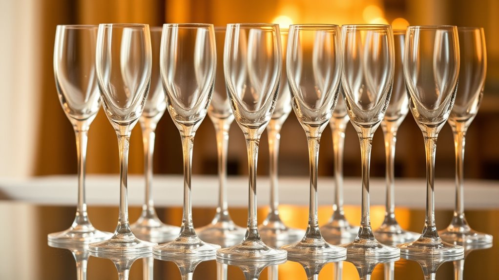 I store my champagne flutes carefully to prevent damage, choosing a dedicated glass rack or a padded cabinet. I avoid stacking or placing them near heavy objects, which could cause chips or cracks. Using soft cloth or tissue between glasses prevents scratches. While it might seem simple, proper storage is essential to keep my flutes sparkling and intact, ensuring they’re ready to elevate every celebration without worry.