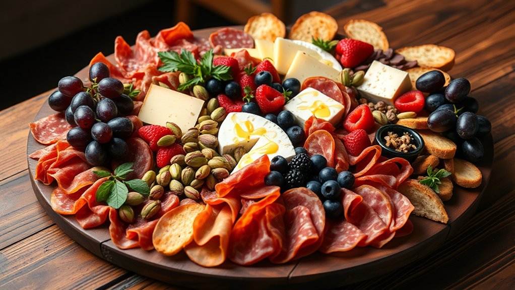 If you want to wow your guests, customize your charcuterie board for the occasion by choosing a theme that speaks to the event’s vibe. For a romantic night, I add heart-shaped cheeses and red fruits; for a celebration, I include vibrant candies and festive decorations. Mix colors, textures, and special ingredients—like edible flowers or gourmet spreads—to make it truly unforgettable and perfectly tailored.