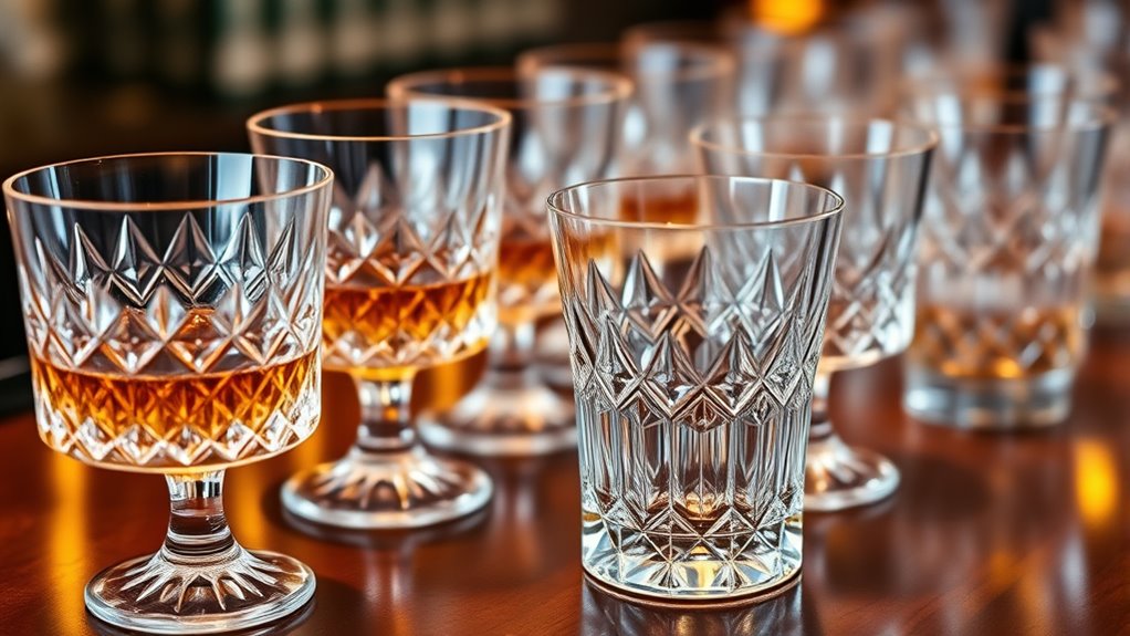 The design and aesthetics of crystal whiskey glasses play a essential role in shaping your overall drinking experience. A well-crafted glass with intricate cut patterns, etchings, or decorative rims adds an elegant touch that elevates any setting. The shape of the glass, especially the bowl size and lip design, influences aroma concentration and makes sipping more comfortable. High-quality crystal with brilliant refraction enhances the visual appeal by highlighting the spirit’s color and clarity. Unique design elements like textured surfaces or thematic motifs can also reflect your personal style or complement your decor. When choosing a glass, consider how its visual details align with your taste and environment, ensuring it not only looks stunning but also enhances your enjoyment of whiskey.