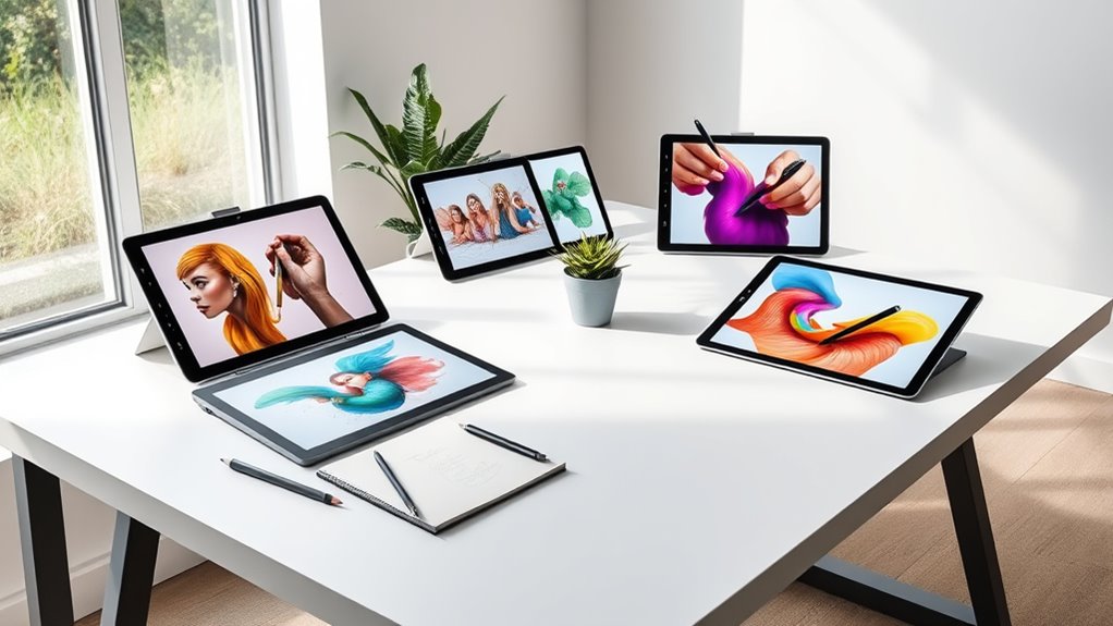 If you’re searching for the best drawing tablets for professionals in 2025, I’ve got you covered. Top options include high-resolution screens like the XPPen Artist Pro 24 Gen2, offering exceptional color accuracy and a large workspace. For portability, the PicassoTab X is a great standalone choice. Accessories like styluses with high pressure sensitivity and ergonomic stands also make a big difference. Keep exploring further to find the perfect device tailored to your creative needs.