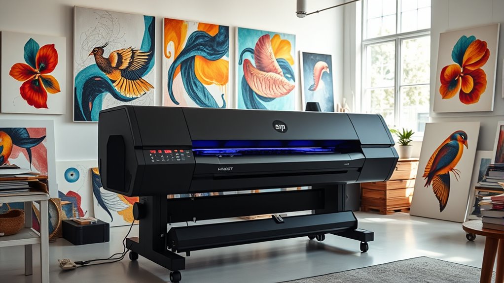 Choosing a fine art printer requires paying close attention to print quality and resolution, as these factors directly impact the detail and sharpness of your reproductions. A high resolution, typically at least 1200 DPI, guarantees smooth gradients and crisp lines, making your prints look professional and gallery-ready. Resolution affects how well fine details are captured, so investing in a printer with excellent DPI is essential. Additionally, the printer’s ability to produce sharp images depends on its overall build and calibration. While resolution is critical, don’t forget that consistent color management also plays a role in achieving high-quality results. Ultimately, a combination of high resolution and precise calibration ensures your artwork is reproduced with the clarity and finesse it deserves.