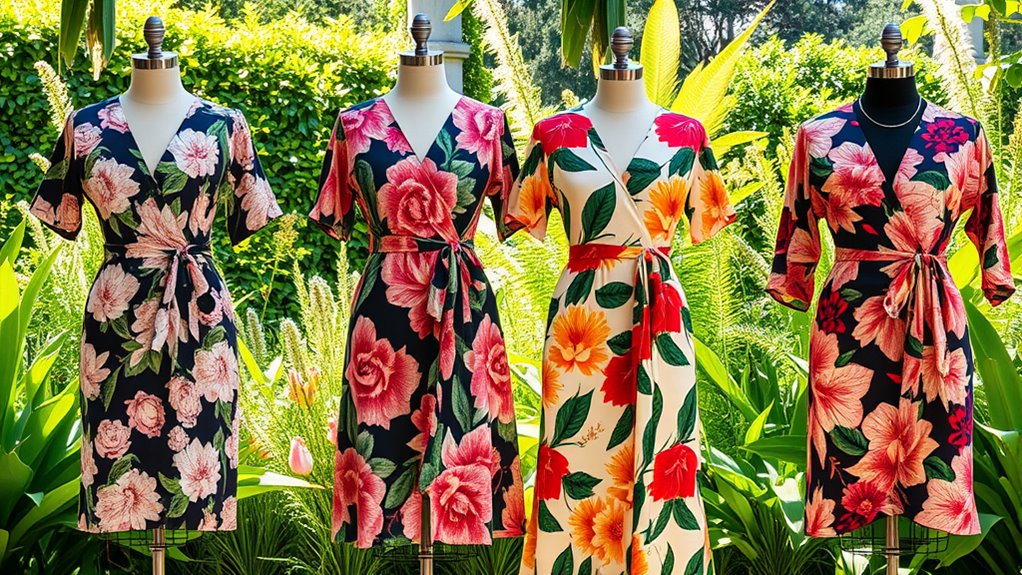 To care for floral wrap dress fabrics, I always follow a simple routine: read the care label, wash gently, and avoid harsh detergents. I prefer hand washing or using a delicate cycle for delicate fabrics, and I hang dresses to dry—never tumble dry. Iron on low heat if needed, and store them carefully to prevent wrinkles. Consistent gentle care keeps my dresses looking fresh and beautiful.