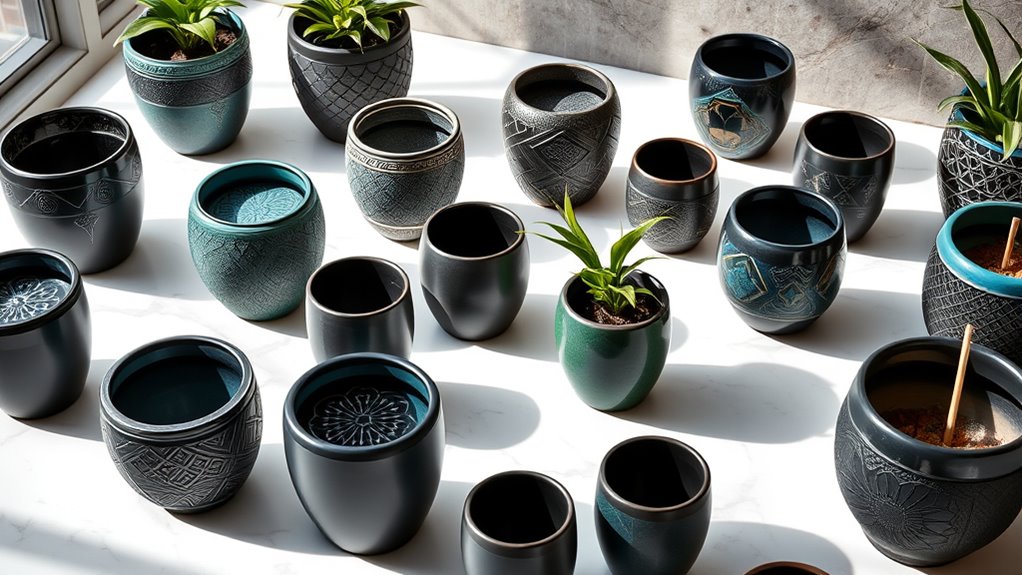Since no two handcrafted ceramic planters are exactly alike, their unique craftsmanship adds significant artistic value. I find that intricate details like embossed patterns, glaze effects, and textured surfaces truly showcase the artisan’s skill and creativity. High-quality materials, such as durable ceramic or stoneware, not only enhance longevity but also elevate the visual appeal. Imperfections and variations in glaze or carving, often seen as flaws, actually give each piece character and authenticity, making it one-of-a-kind. Artisan-crafted planters typically undergo meticulous finishing processes, like hand-painting or specialized glazing, which further emphasize their artistic nature. These craftsmanship details transform a simple planter into a true piece of art, adding depth and personality to your decor.