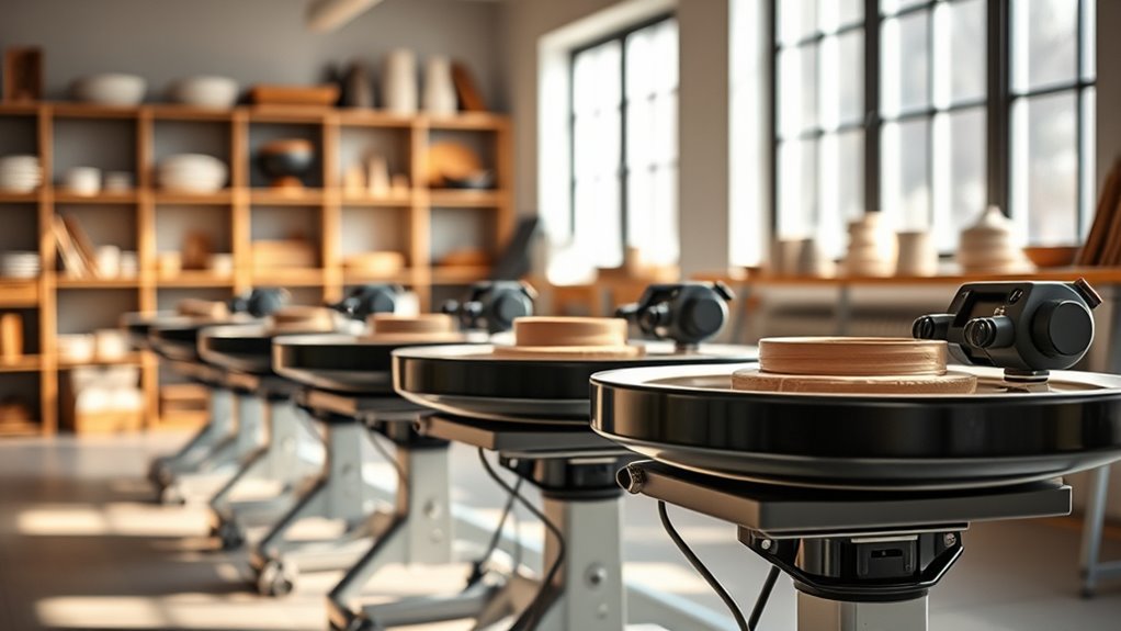 Have you ever noticed how much noise a pottery wheel makes during extended sessions? High-end models operate below 60dB, creating a quieter environment that helps me focus and reduces fatigue. Stability is equally critical—I look for reinforced bases, non-skid rubber feet, or triangular supports that prevent wobbling at high speeds. The weight and construction materials, like cast iron or heavy-duty metal, also matter because they lower vibrations and keep the wheel steady. Adjustable height and secure locking mechanisms are essential for working on uneven surfaces or changing heights comfortably. Consistent stability and low noise not only improve precision but also make long sessions more enjoyable. When choosing a wheel, I prioritize these factors to guarantee my workspace remains calm and stable, enhancing my overall crafting experience.