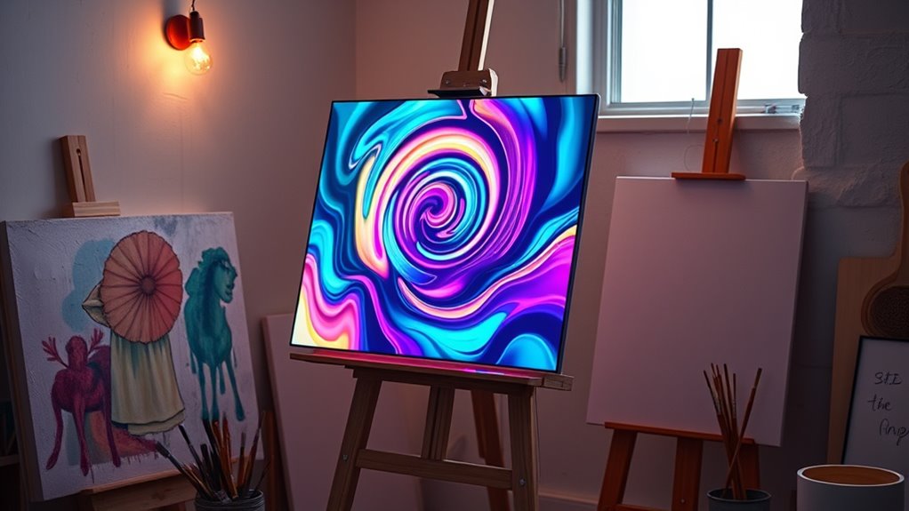Choosing an interactive light board with adjustable stand features is essential for creating a comfortable and efficient workspace. An adjustable stand lets me modify the viewing angle, which helps reduce neck and back strain during long sessions. Multiple tilt and height options let me customize the setup for different projects and ergonomic needs, boosting both comfort and precision. Stability is key—if the stand wobbles or moves unexpectedly, it can disrupt my workflow or damage delicate work. Some boards have foldable or collapsible stands, making them easy to store and transport, perfect for artists on the go. Additionally, adjustable brightness controls often come with stand features, letting me optimize lighting angles and intensity simultaneously for the best viewing experience.