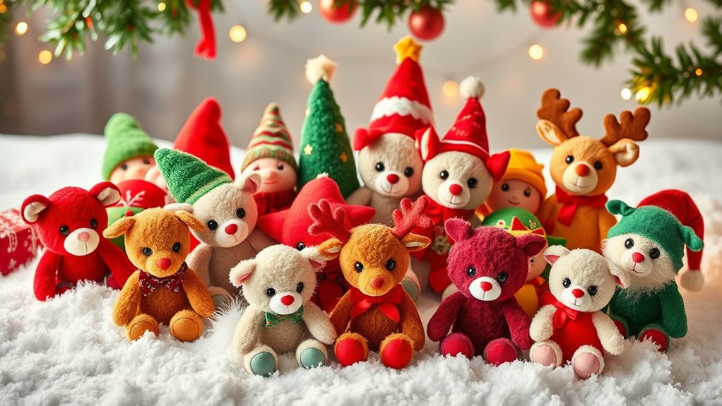 The softness of Jellycat Christmas collection items mainly comes from their use of premium-grade plush fabrics that feel gentle and inviting to the touch. These fabrics are specially sourced to guarantee a luxurious feel, making each toy incredibly cuddly. The multi-layer construction and hand-finished details not only boost durability but help preserve their plush texture even after many washes. Different textures like fleece, suedette, and velvety fur add variety, catering to all ages and preferences. Jellycat carefully selects materials to guarantee longevity, so these toys remain soft and cuddly over time. Overall, their focus on high-quality, soft materials is a key reason why Jellycat plush toys are beloved for comfort, joy, and lasting appeal, making them perfect holiday gifts.