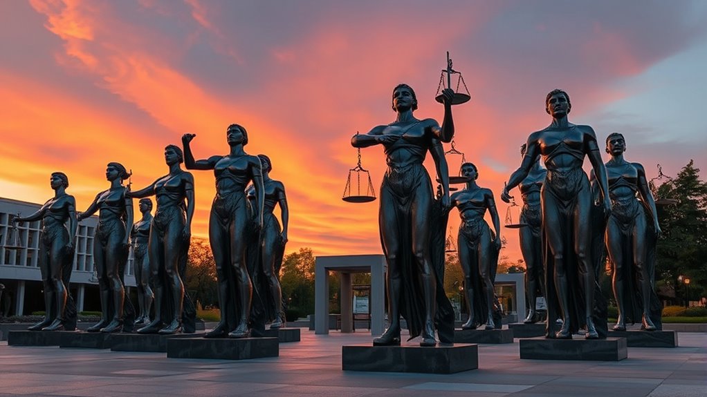 When considering the design intricacies and styles of large metal sculptures on justice, it’s important to also think about what symbols you want them to convey. Symbols like scales, swords, blindfolds, or Lady Justice embody core values such as fairness, impartiality, and moral righteousness. These elements serve as powerful visual cues that reinforce the principles of integrity, balance, and authority. Choosing specific symbols can highlight the societal importance of justice, acting as a reminder of ethical standards and societal commitments to truth. Additionally, symbolic elements often evoke a sense of strength and stability, emphasizing justice’s enduring nature. Carefully selecting symbols ensures your sculpture communicates a meaningful message, resonating with viewers and reinforcing the foundational ideals of justice.
