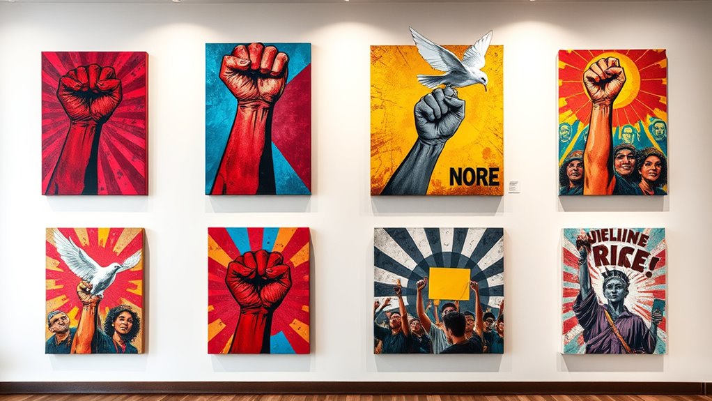 Choosing the right activist art canvas isn’t just about aesthetics; it’s about supporting causes you believe in. When selecting a piece, consider how it aligns with your values and the issues you care about. Many limited edition activist artworks donate a portion of proceeds to related charities, so your purchase can directly help social and political movements. Collecting these pieces not only raises awareness but also amplifies marginalized voices, promoting social justice on a global scale. The limited edition status can boost the artwork’s visibility and value, encouraging more support and engagement. By choosing art that resonates with your beliefs, you make your support meaningful and foster a sense of community around shared causes. Supporting causes through art transforms your collection into a powerful statement of activism.