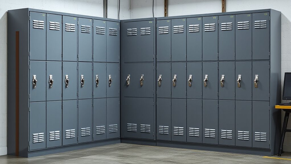 When selecting a lockable metal storage cabinet for a studio, considering storage flexibility is key to ensuring it meets your evolving needs. Adjustable shelves are essential, allowing me to customize the interior to fit items of different sizes and maximize space. Multiple compartments and levels help organize tools, documents, and equipment efficiently, reducing clutter. Features like removable or foldable shelves boost flexibility, making it easier to store bulky or irregularly shaped items. Modular or stackable units are also beneficial, enabling me to expand storage capacity as my needs grow without replacing the entire cabinet. finally, configurable interior layouts provide secure, versatile storage that adapts to changing requirements, ensuring my studio stays organized and functional over time.