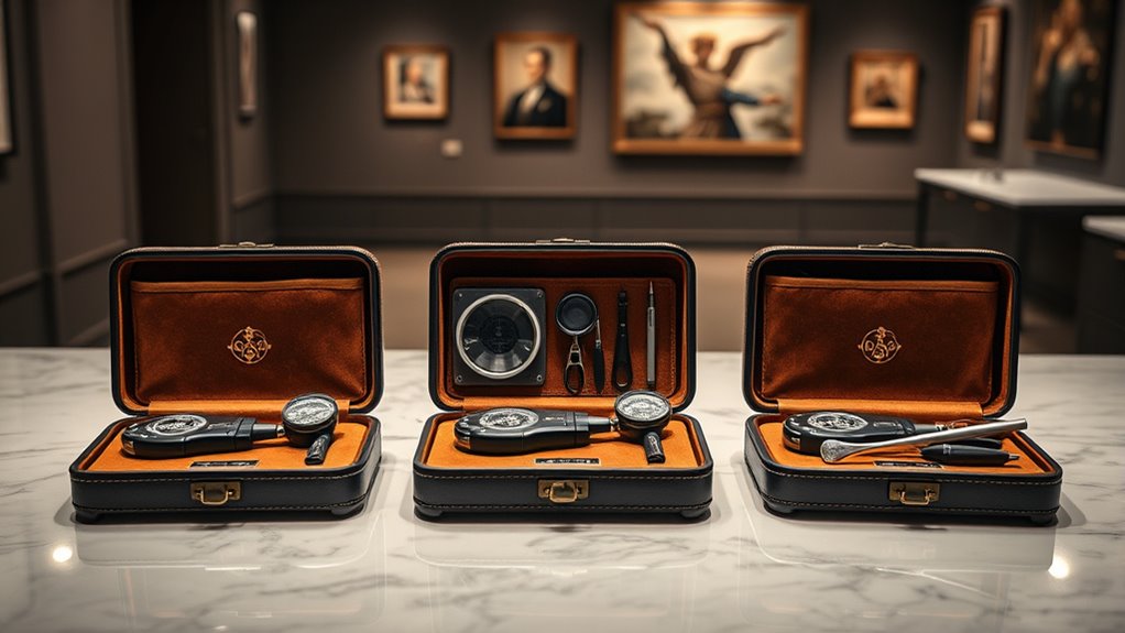 When choosing a luxury art appraisal toolkit, I look for safety features like secure storage compartments to protect valuable documents and tools, anti-theft zippers, and sturdy construction to prevent damage during transport. It’s also important to have tamper-evident seals and a lockable case to guarantee confidentiality. These features give me peace of mind knowing my high-value items are protected and secure during inspections and transport.