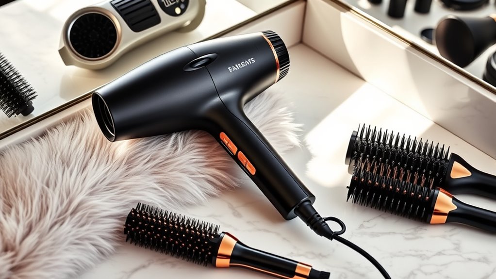 Selecting a luxury hair dryer with versatile heat and speed settings is essential for achieving ideal styling results. Multiple options allow me to customize my styling, whether I want gentle drying or a quick blowout. Adjustable temperature controls help prevent heat damage, giving me precise control over heat levels. Higher speed settings speed up drying, especially for thick or unruly hair. I also appreciate the cool shot button, which locks in my style with a burst of cold air, reducing the need for excessive heat. Being able to switch seamlessly between heat and speed levels enhances my control and flexibility during styling. This adaptability makes my routine more efficient and helps me achieve salon-quality results at home with less effort.