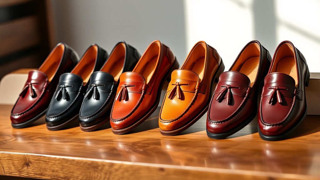 Since style and versatility are key when selecting men’s leather loafers, it’s important to contemplate how their design and color options can fit into your wardrobe. Leather loafers come in various styles like classic penny, tassel, and bit designs, making them suitable for both formal and casual occasions. Their color options—black, brown, tan, and cognac—further increase their adaptability to different outfits. Sleek silhouettes and minimal embellishments make them perfect for dressier events, while relaxed styles work well for casual outings. The ability to dress up or down with a single pair of loafers adds practicality and value. Choosing versatile styles ensures you can seamlessly shift from office meetings to weekend adventures, making these shoes a smart addition to any wardrobe.