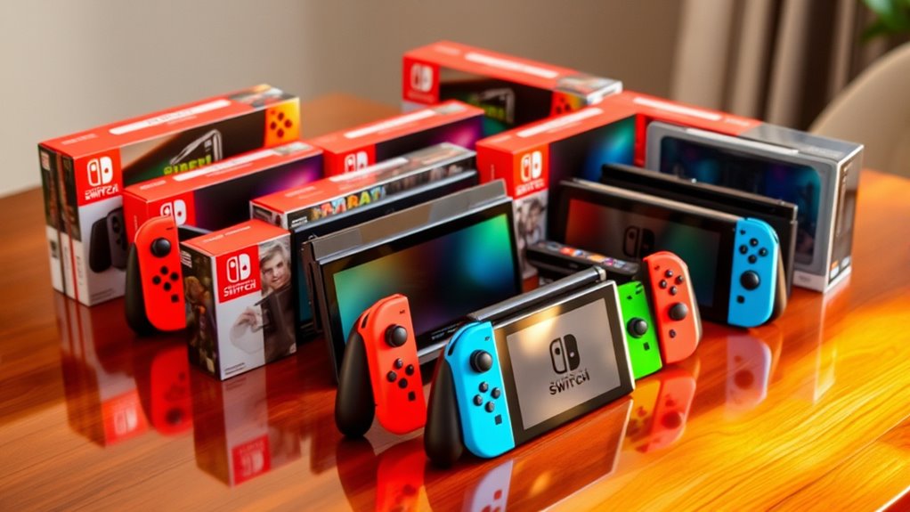 Choosing the right Nintendo Switch 2 bundle means paying close attention to its components and content, as these elements directly impact the overall value and gaming experience. The bundle can include the console, controllers, and sometimes extra accessories like grips or cases, which enhance playability and durability. Content varies from full game downloads, physical discs, or digital codes, giving you different gameplay options. Some bundles offer exclusive items like steering wheels or travel cases, adding extra appeal. Additionally, online memberships and extra storage options can boost convenience and add value, especially for avid gamers. Carefully reviewing what’s included helps guarantee you get the features you want without paying for unnecessary extras, making your purchase both enjoyable and cost-effective.