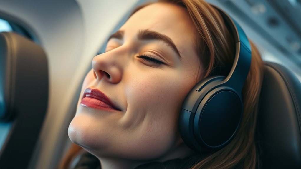 A comfortable fit is essential for enjoying noise-cancelling headphones during long trips, as discomfort can quickly ruin the experience. Look for headphones with adjustable headbands and soft, plush ear cushions to guarantee a snug yet comfortable seal. Over-ear designs often provide better comfort and noise isolation compared to on-ear or in-ear models, making them ideal for extended wear. Lightweight headphones, weighing under 250 grams, help reduce fatigue and discomfort during long journeys. Breathable materials like memory foam and protein leather ear cups prevent overheating and sweating, keeping you comfortable throughout your trip. Proper fit isn’t just about comfort; it also enhances noise cancellation by creating a seal around your ears, blocking out external sounds and maximizing audio clarity.