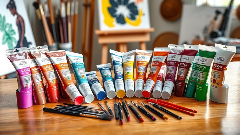 Selecting the right packaging for non-toxic oil paints is essential to guarantee their longevity and ease of use. I look for sets that come with durable, reusable containers or cases to protect my paints and keep them organized. Airtight caps or seals are a must, as they prevent paints from drying out and maintain freshness over time. I prefer packaging with compartmentalized boxes or trays, which help keep colors separated and easily accessible during projects. Portability also matters, especially for outdoor work; lightweight, compact options make transportation effortless. Lastly, secure closure mechanisms are crucial to prevent spills or leaks, particularly when storing paints in backpacks or travel kits. Good packaging ensures my paints stay fresh, organized, and ready whenever I need them.