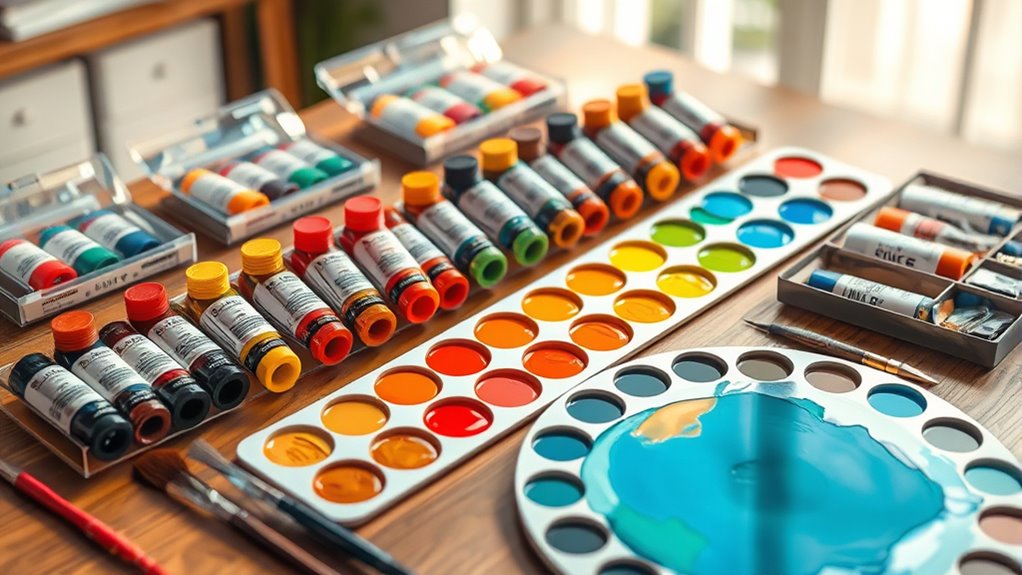 Considering the packaging and storage options helps keep your supplies organized, but it’s also important to evaluate a set’s price and overall value. The cost often reflects the quality of pigments—higher-quality sets generally cost more because of better ingredients. To determine value, look at how much paint is in each tube and the total number of colors included, which impacts how much artwork you can produce before needing a refill. Sets with larger tubes, like 50ml or 100ml, tend to offer better long-term value for frequent painters. When comparing prices, consider whether the set contains professional-grade or student-grade paints, as this affects both quality and cost-effectiveness. Investing wisely in a high-value set can save money by providing vibrant, durable paints that need fewer coats.