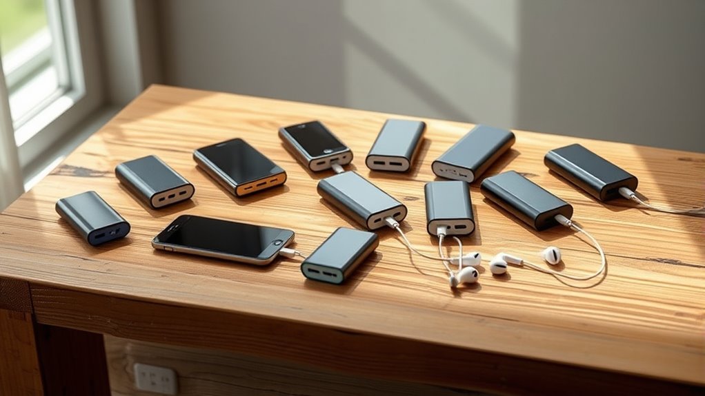 Different battery technologies markedly impact how a portable power bank performs, so understanding their differences can help you select the right one. Lithium-ion (Li-ion) batteries are the most common, offering high energy density and being lightweight, which makes them ideal for everyday use. Lithium-polymer (LiPo) batteries provide similar capacity but can be molded into slimmer, more flexible shapes, perfect for compact designs. Emerging solid-state batteries promise higher safety and energy density, but they’re not yet widely available in consumer power banks. Battery technology also influences charge cycles; LiPo batteries typically last longer than traditional Li-ion cells. Additionally, different types affect charging speed, safety features, and overall durability—important factors to contemplate for reliable, long-lasting power on the go.