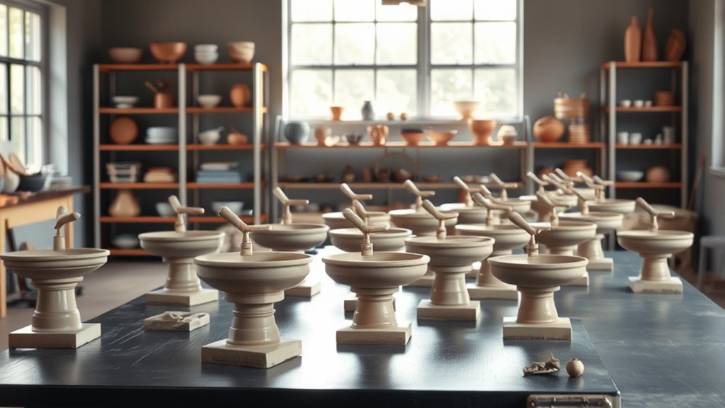 When selecting a pottery wheel for professional use, considering its adjustability options is essential to guarantee comfort and precision during extended sessions. An adjustable height, typically ranging from 0-2 inches, helps accommodate different user heights, reducing strain and improving ergonomics. Variable speed control, from 60 to 300 RPM, allows precise management during centering, shaping, and finishing. Reversible turntable direction offers flexibility for both left- and right-handed workflows, which is vital for diverse projects. Some wheels feature customizable foot pedals or control knobs, enabling seamless, hands-free adjustments of speed and rotation. Ergonomic enhancements like easy-to-use levers or knobs further contribute to a comfortable, efficient working environment. Overall, these adjustability options help professional artists work longer with greater accuracy and less fatigue.