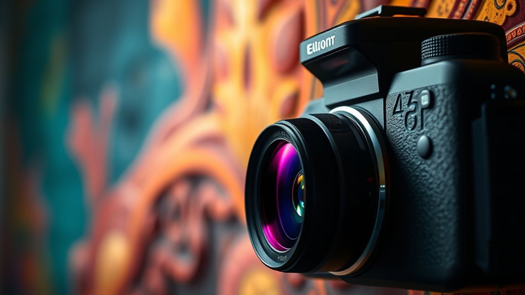 Ever wonder how digital cameras achieve true-to-life colors in art reproduction? It all starts with a sensor that offers a wide color gamut and high dynamic range, capturing subtle color variations accurately. Advanced white balance algorithms are pivotal—they adjust for different lighting conditions, ensuring colors stay natural and consistent. Support for color calibration profiles and color management workflows helps maintain precise color output across various devices and media. Manual color controls, like adjustable saturation, hue, and contrast, provide fine-tuning options to match the artwork’s true colors. Additionally, high-quality lenses with minimal chromatic aberration and excellent light transmission are essential for faithful color capture without distortion or fringing. Together, these features make a camera capable of reproducing art with exceptional color accuracy and fidelity.