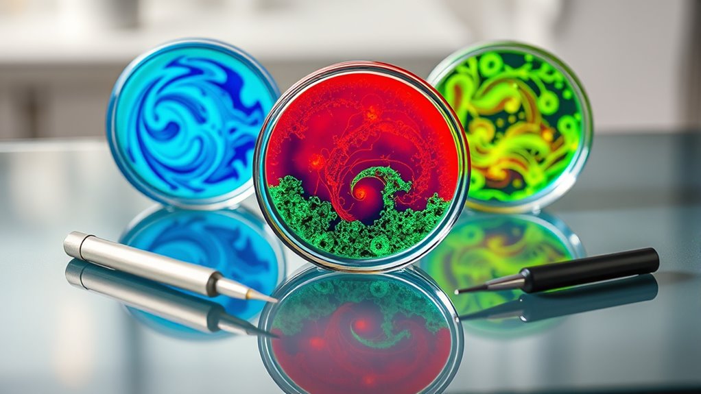 If you’re looking to unleash your creativity with petri dish art, I recommend exploring premium kits like Evviva Sciences and BIPEE, which offer high-quality, sterile dishes perfect for intricate designs. These kits come with tools like swabs and pipettes, making art and microbiology fun and safe. They’re ideal for hobbyists, students, and educators. Keep exploring to discover the top options that blend science and art seamlessly in 2025.