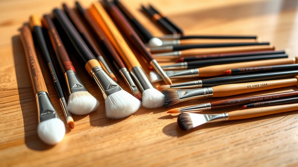 Think of your brushes as delicate garden tools; with care, they’ll flourish. I always rinse my brushes thoroughly after each use, shaping the bristles gently and avoiding harsh scrubbing. I also store them upright or flat to prevent damage and occasionally deep-clean with brush cleaner. Proper drying and occasional conditioning keep the bristles soft and flexible, ensuring my brushes stay vibrant and durable for every stroke I make.