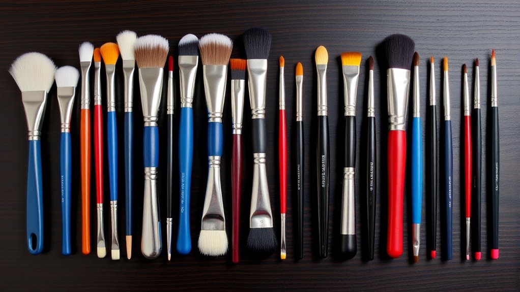 Having a variety of brush shapes helps me achieve different effects, but comfort and control during extended painting sessions are just as important. Ergonomic handles are designed to reduce hand fatigue, allowing me to work longer without discomfort. Handles with a contoured or rounded shape provide a secure grip, preventing slipping and enabling precise movements. The material and finish, like smooth wood or coated surfaces, also influence grip stability and handling. Longer handles give me better leverage for detailed work, while shorter ones are ideal for close-up, fine techniques. Proper handle ergonomics help me maintain steady strokes and reduce strain, which improves overall accuracy and endurance. Choosing brushes with ergonomic handles makes a noticeable difference in comfort and control during my creative process.