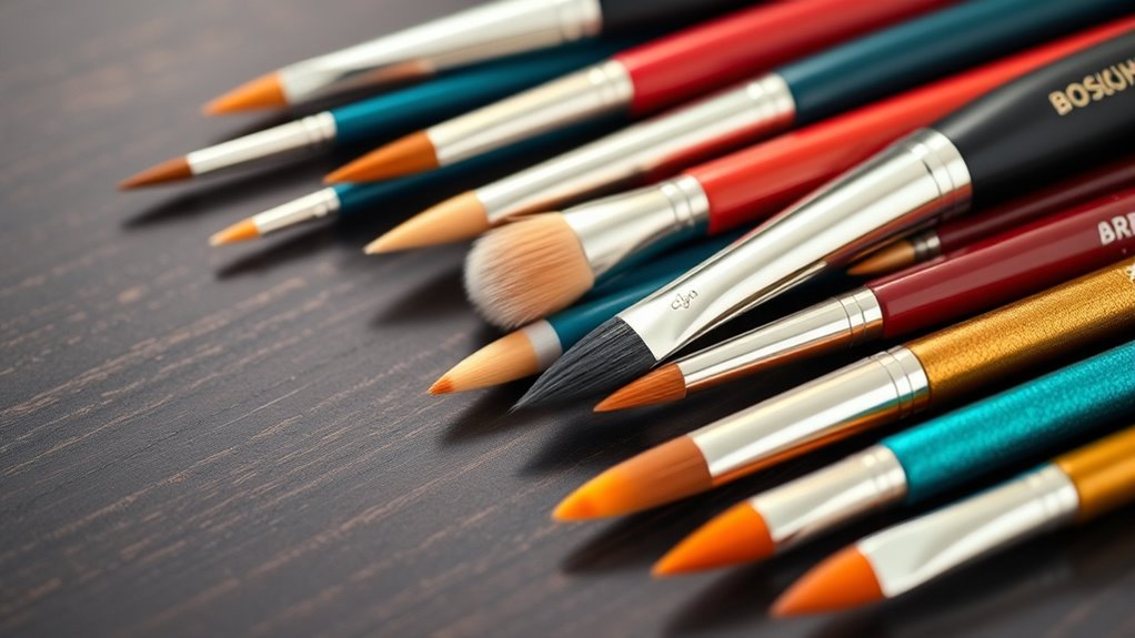 Have you ever wondered how the quality of brush materials impacts your artwork? High-quality brushes, whether made from natural hog bristle, sable, or premium synthetic fibers, make a significant difference. Natural hog bristle brushes are stiff, hold more paint, and excel with oil or impasto techniques. Sable brushes are softer, perfect for watercolor and detailed work. Synthetic brushes, often crafted from nylon or Taklon, can mimic natural hairs and tend to be more affordable, durable, and versatile across mediums like acrylics and watercolors. The right material guarantees your brush maintains its shape through multiple washes and extensive use, preventing shedding, cracking, or splitting. Investing in top-quality materials guarantees consistent, professional results, elevating your art with tools built to last and perform reliably over time.